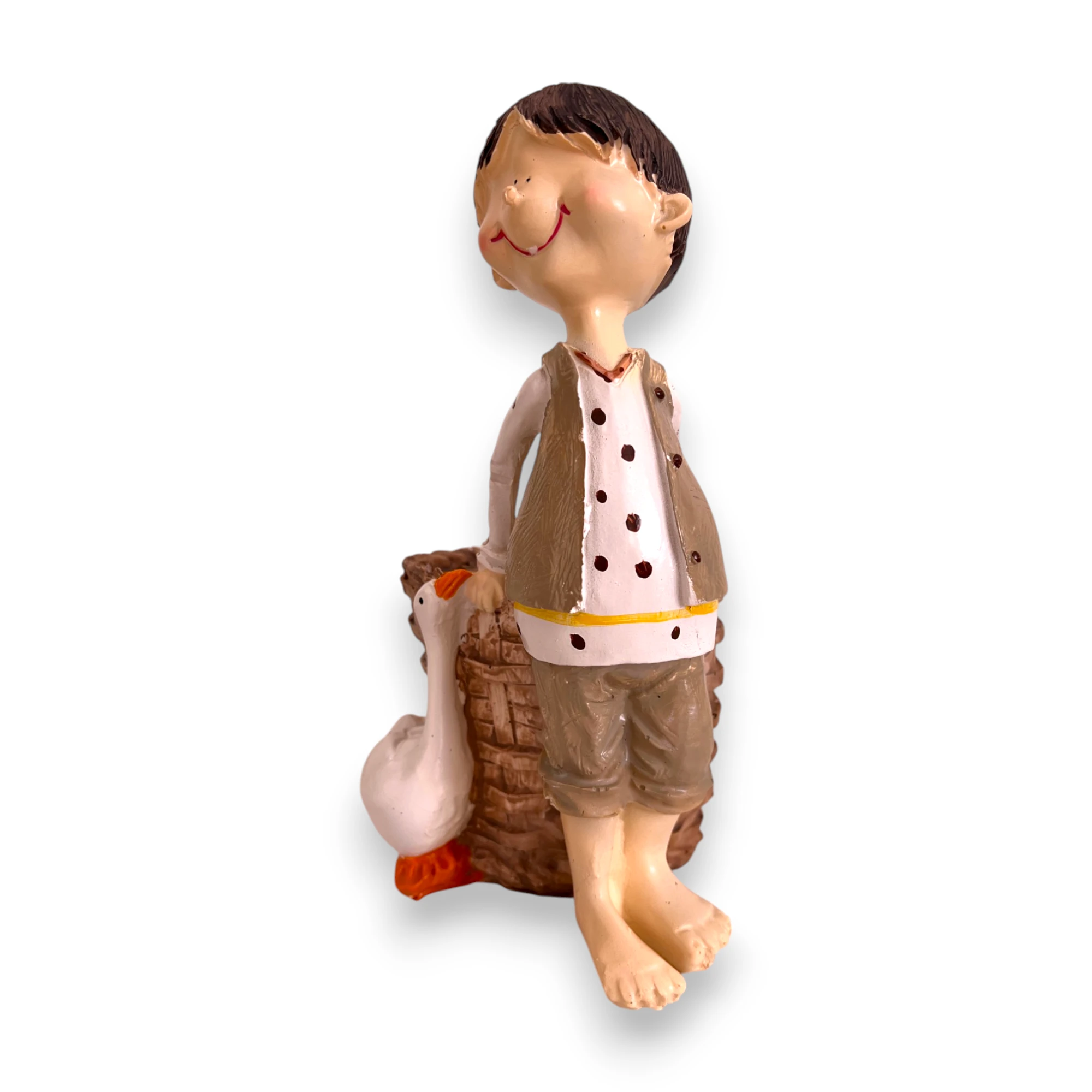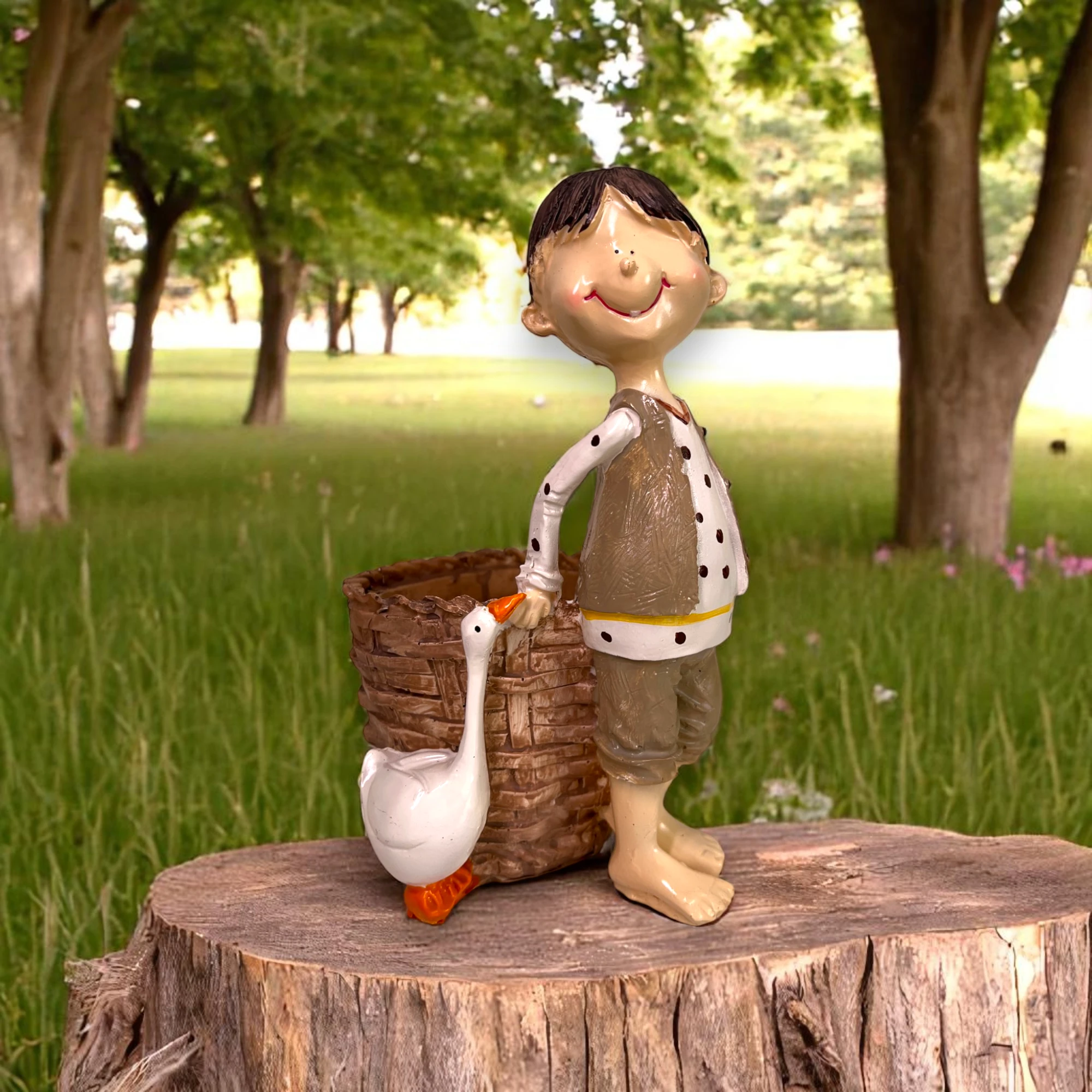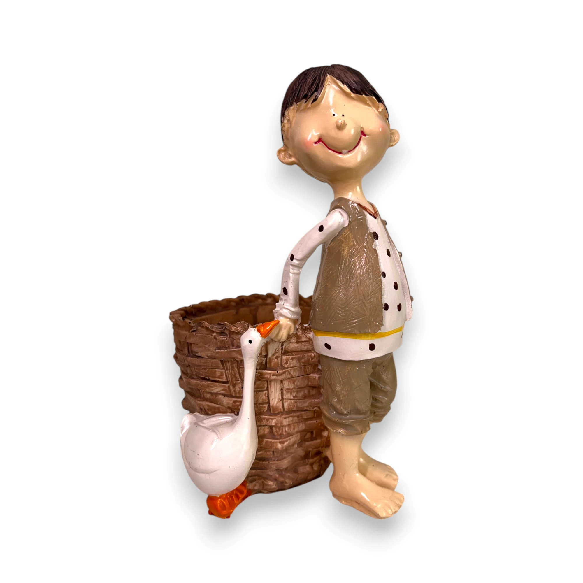 Çocuk figürü ve kaz tasarımıyla dikkat çeken bu dekoratif obje; masa üstü kalemlik, minik saksı ya da sevimli bir aksesuar olarak kullanılabilir. Ev dekorasyonunuza neşe katacak!